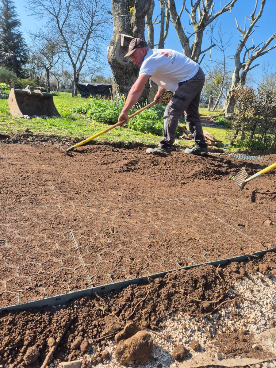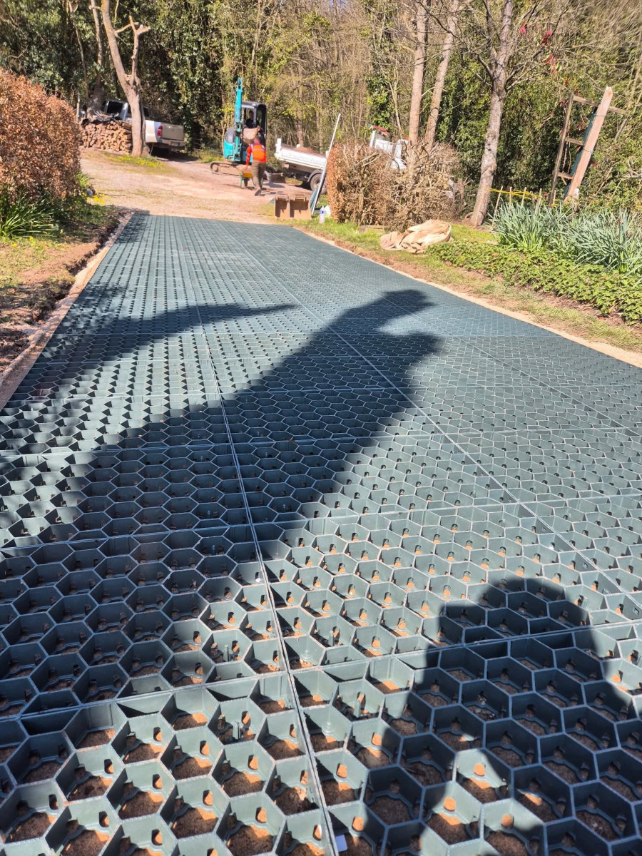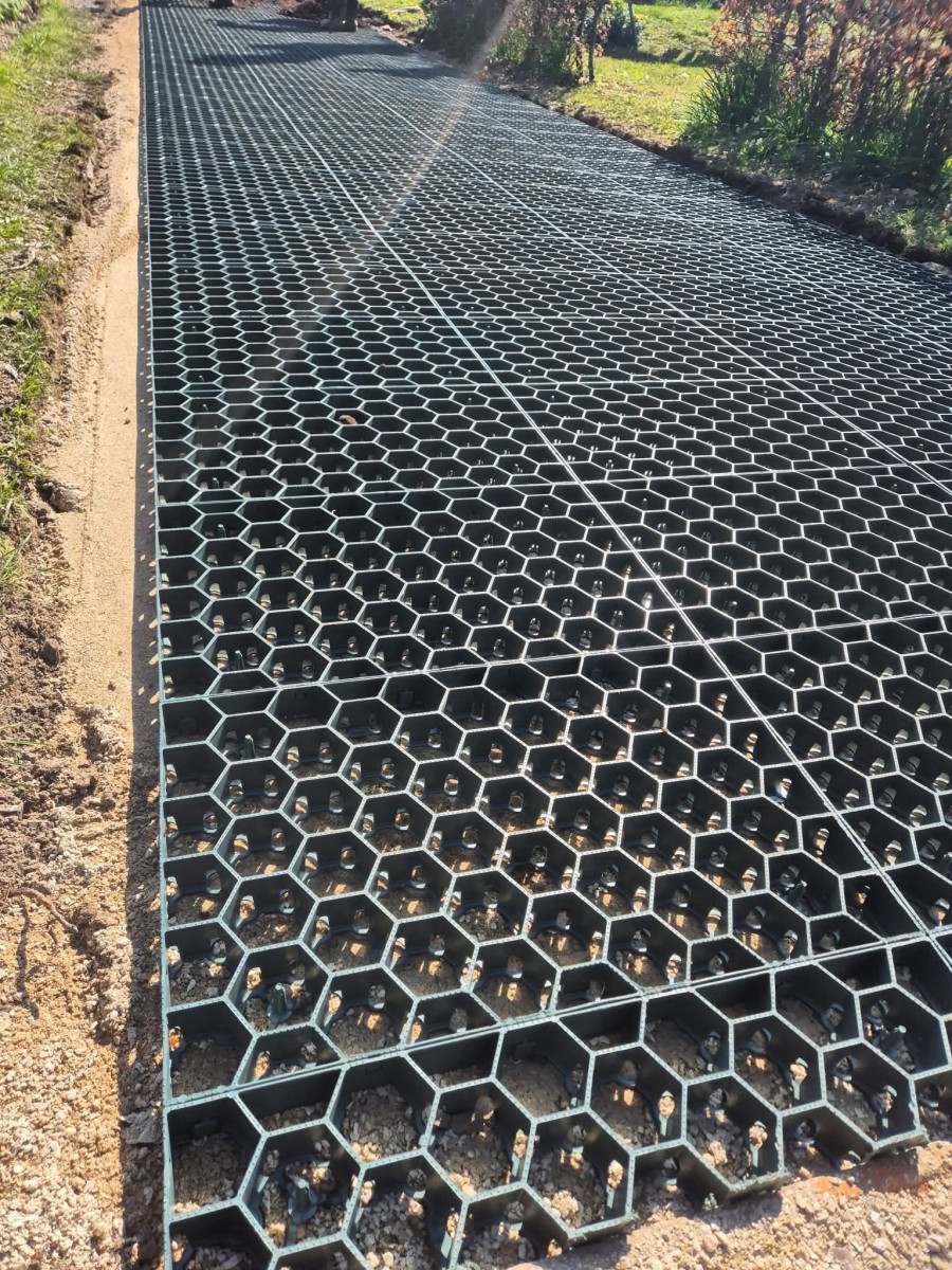 Dalles de type nid d'abeilles intégrées dans une terre végétale engazonnée alliant solidité, drainage naturel et esthétique paysagé.